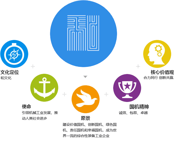 國機集團的企業(yè)文化體系建設以“和”文化為核心。這種“和”文化源于中國傳統(tǒng)的價值觀,體現了國機集團“合力同行、創(chuàng)新共贏”的核心價值,是對推動國機集團近年快速發(fā)展的先進文化價值的提煉,也是國機集團努力營造和諧、積極、健康、向上的組織氛圍,激發(fā)團隊活力,提升協(xié)作效率,增強組織向心力、凝聚力、競爭力的需要。國機人以“引領機械工業(yè)前進方向,創(chuàng)新機械工業(yè)發(fā)展道路”為使命,以“機械工業(yè)的領跑者,社會價值的創(chuàng)造者”為愿景。這種“和”文化建設,具有鮮明的時代特征, 反映了國機集團貫徹科學發(fā)展觀,致力于和諧企業(yè)、和諧社會建設的理想和不懈追求。