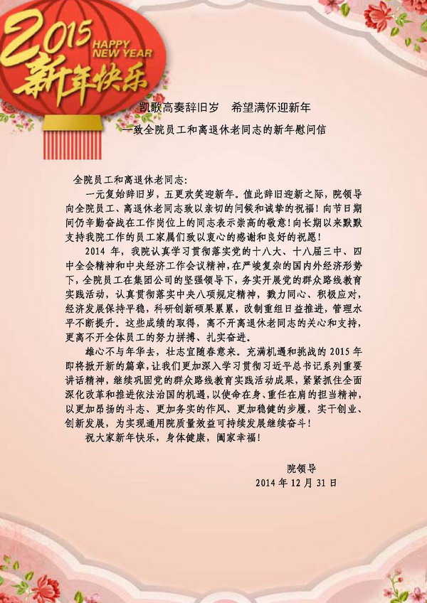 凱歌高奏辭舊歲 希望滿懷迎新年--致全院?jiǎn)T工和離退休老同志的新年慰問信